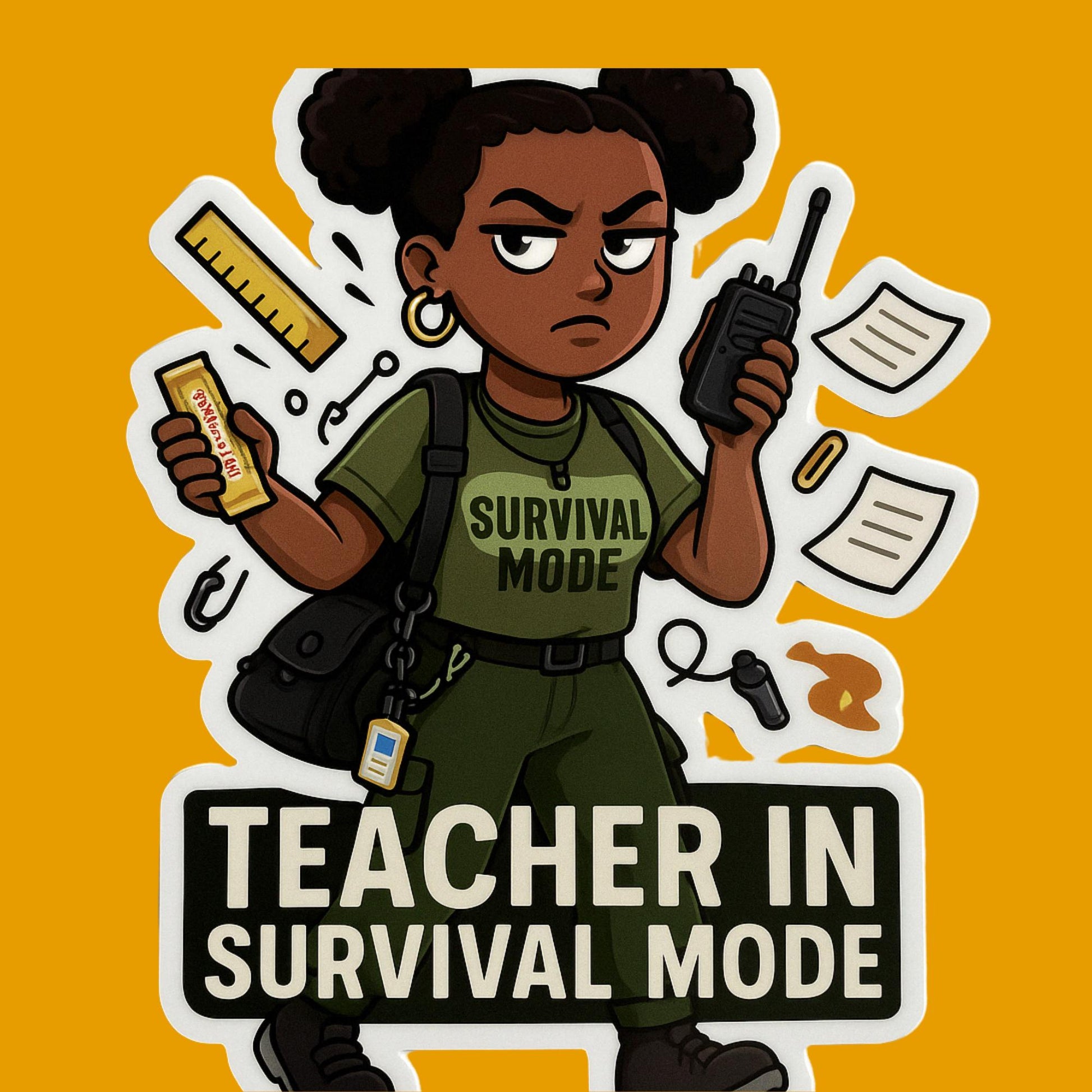 These glossy cartoon stickers showcase stylish Black women teachers navigating May with iced coffees, messy buns, grading piles, and fierce side-eyes — all in a relatable, hilarious, and affirming way.